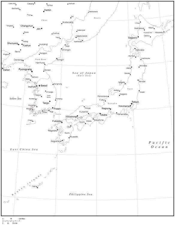 Black & White Japan Map with Countries and Major Cities JPN XX
